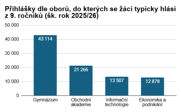 A největší zájem měli deváťáci o následující programy: čtyřletá gymnázia, lycea, obchodní akademie, informační technologie, ekonomika a podnikání. Jde o obory, které mají velmi silný všeobecný základ.