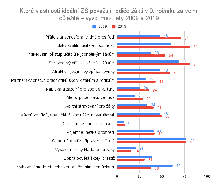 Proměnu názorů rodičů dokládají reprezentativní data (Prokop et al., 2020). Ještě v roce 2009 si 62 % rodičů deváťáků spojovalo ideální školu s vybavením moderní technikou a pomůckami. V roce 2019 je to už pouze 38 %. Mezi lety 2009 a 2019 výrazně narostl podíl rodičů, pro něž je v ideální škole zásadní přátelská atmosféra (z 48 % na 71 %), lidská kvalita učitelů (z 60 % na 81 %) a jejich individuální spravedlivý přístup k žákům (z 38 % na 54 %). Autoři studie se domnívají, že „…proměnu lze opět do jisté míry dát do souvislosti s generační výměnou rodičů i s tím, že si oni sami více uvědomují zásadní vliv samotných učitelů a klimatu školy na vzdělávání jejich dětí.” (Prokop et al., 2020, s. 5)