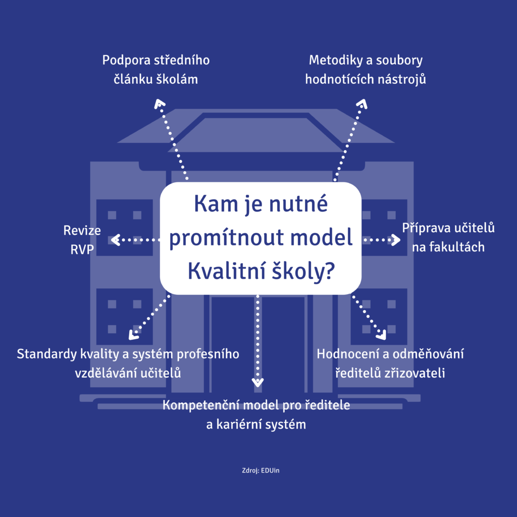 Model a kritéria Kvalitní školy vytvořily základ popisu žádoucí kvality činnosti škol. Kritéria jsou dle příslušného ustanovení školského zákona každoročně schvalována Ministerstvem školství a využívána Českou školní inspekcí. Systémově je model pro všechny aktéry závazný a vymahatelný (ČŠI, 2021a). Jak ale z Kvalitní školy udělat sdílenou vizi pro všechny ředitele, učitele a další aktéry, aby se s ní nepotkali pouze jednou za šest let v rámci inspekční činnosti ČŠI? Zde je nutné dohnat několik starých dluhů (Stuchlíková & et al., 2018).
