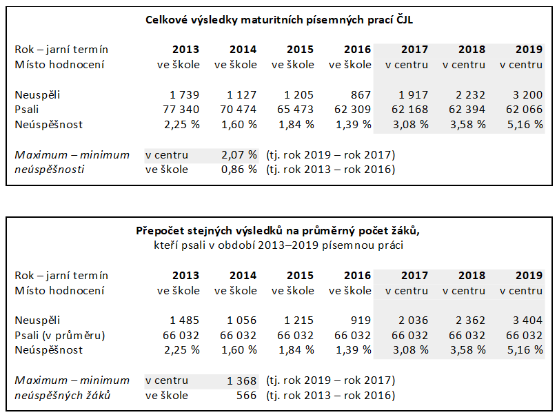 - Teoreticky mohla být letošní jarní zadání náročnější než loňská. Zjistit dopad případného rozdílu ovšem není z celkových agregovaných výsledků možné. Poslanecká novela školského zákona hodlá vrátit školám nejen hodnocení písemných prací, ale rovněž přípravu jejich zadání.