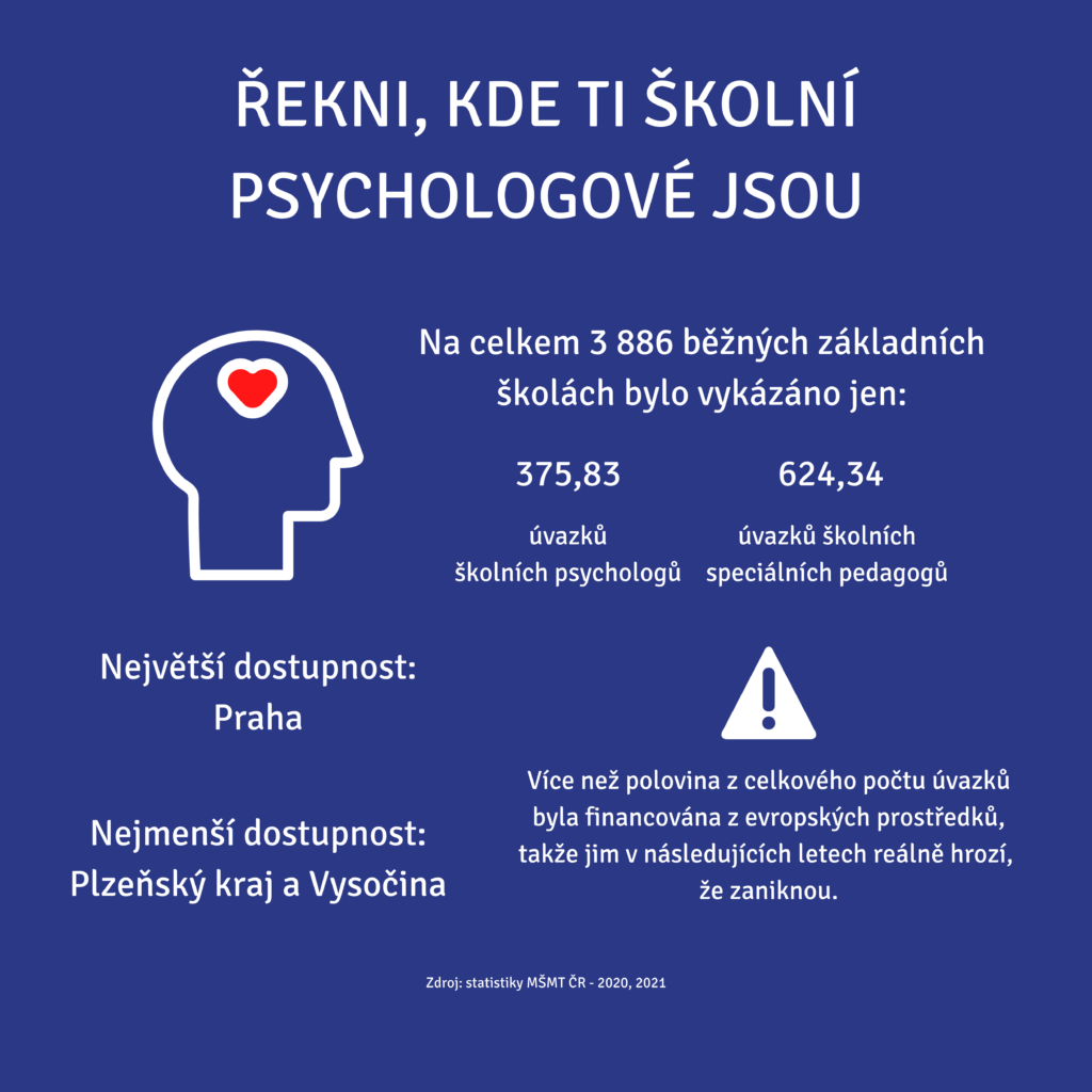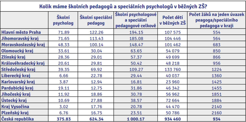Podle statistik Ministerstva školství z průběhu roku 2020 bylo přesto v celkovém počtu 3 886 běžných základních škol vykázáno jen 375,83 úvazků školních psychologů a 624,34 úvazků školních speciálních pedagogů. Nejvíce jsou tyto pozice k dispozici žákům v Praze, naopak nejméně dostupné jsou v Plzeňském kraji či na Vysočině.