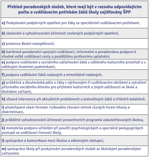 Pokud se zaměříme na situaci ve školách, jádrem poradenství je školní poradenské pracoviště (ŠPP). Za jeho zřízení odpovídá ředitel školy, popř. jím pověřený pracovník. Samotné poradenské služby ve škole jsou obvykle zajišťovány výchovným poradcem, školním metodikem prevence, případně školním psychologem/školním speciálním pedagogem a jejich konzultačním týmem, který je složen z vybraných pedagogů školy (NPI ČR, 2021a). Zde je nutné zmínit, že ze zákona jsou povinnými pozicemi školního poradenství pouze „preventista” a výchovný poradce, kteří jsou za poměrně náročnou práci odměněni spíše symbolickým snížením úvazku a základním specializačním příplatkem. Systémové řešení, v němž by byli přiřazováni školní psychologové nebo speciální pedagogové tzv. „na školu”, neexistuje, a to navzdory závazkům vzdělávací politiky z minula. Záleží tedy především na schopnosti ředitelů škol tyto pozice finančně a personálně zajistit z národních nebo evropských zdrojů či s přispěním svého zřizovatele. To přirozeně vede k zásadním rozdílům v kvalitě a podpoře vzdělávání žáků (ČŠI, 2020; Stuchlíková & et al., 2018 – viz použitá literatura).